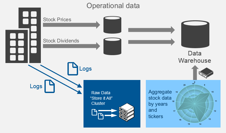 In addition to traditional data warehousing, when operational data stored in special structures in Enterprise Data Warehouse, we can store all other raw data in “Store it All” cluster. At any moment, we are able to create query to these data to answer some business question. (In addition, we may store the answer in the Data Warehouse if necessary)
