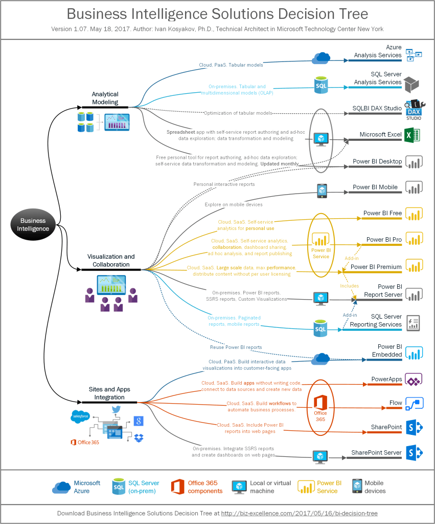 In this article we will cover most important Business Intelligence components based on Microsoft Data Platform. One week ago there were announcements on Power BI Premium and Power BI Report Server which will require some clarification, so I decided to create another decision tree describing available Microsoft analytical modeling and visualization tools, and covering Power BI related components in more detailed way.