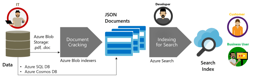 - Data integration with JSON data structures. Indexers can be used to automatically crawl Azure SQL Database, Azure Cosmos DB, or Azure Blob storage for searchable content in primary data stores. Azure Blob indexers can perform document cracking to extract text from major file formats, including Microsoft Office, PDF, and HTML documents.