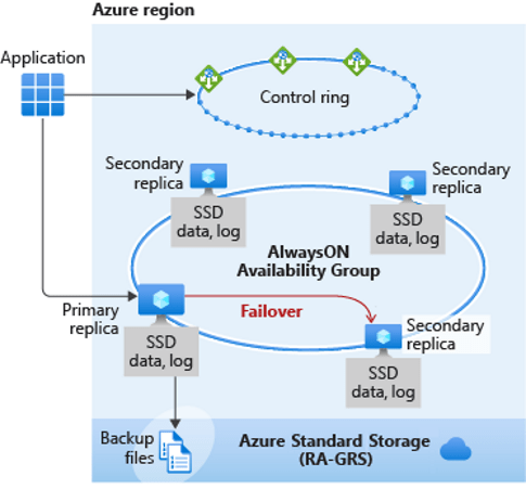 The Premium and Business Critical tiers for Azure SQL Managed Instance (as well as Azure SQL Database) have an Always On Availability Group feature for disaster recovery and high-availability of the application. There’s a primary read-write replica, and several secondary read-only replicas. The secondary replicas are provisioned with the same compute size as the primary replica. You set the connection string option to decide whether the connection is routed to the write replica or to a read-only replica.
